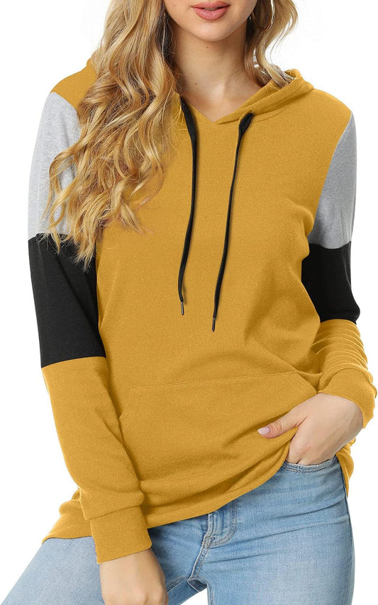 Women's crewneck color block top with ribbed trim and long sleeves.
